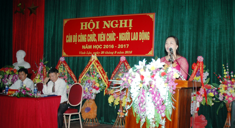 Sau k hi khai mạc Hội nghị, cô giáo Nguyễn Thị Hà – Bí thư chi bộ - Hiệu trưởng nhà trường đã báo cáo tổng kết những kết quả, kinh nghiệm đạt được trong năm học qua để tiếp tục phát huy các mặt ưu điểm, đồng thời đưa ra biện pháp tháo gỡ những khó khăn, khắc phục những hạn chế còn tồn tại; đề ra phương hướng nhiệm vụ chiến lược cho năm học mới 2016-2017.