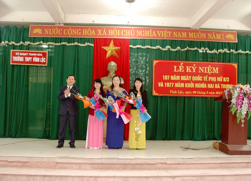 Chiều cùng ngày, THPT Vĩnh Lộc đã tổ chức nhiều hoạt động thiết thực và ý nghĩa nhằm giúp cán bộ nhân viên và học sinh hiểu thêm về truyền thống quật cường, bất khuất của người của phụ nữ trên thế giới nói chung và phụ nữ Việt Nam nói riêng. Phát huy truyền thống của Phụ nữ Việt Nam, các cô giáo và nữ cán bộ nhà trường đã không ngừng nỗ lực học tập, tự trau dồi chuyên môn nghiệp vụ vươn lên trở thành những giáo viên dạy giỏi, những nhà quản lí có tâm, có đức. Toàn trường hiện có 42 nữ cán bộ giáo viên, trong đó có 01 Nữ cán bộ quản lí ( cô Nguyễn Thị Hà – Bí thư chi bộ - Hiệu trưởng); có 04 cô giáo là tổ trưởng chuyên môn, có 04 cô giáo trình độ thạc sĩ, số còn lại 100% đạt chuẩn. Các em nữ sinh trong trường luôn chăm ngoan, học giỏi. Nhiều em liên tục đạt danh hiệu học sinh giỏi toàn diện…